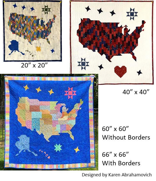 This pattern features 3 sizes with a 4th design option for the 66” x 66” which graphically segments out each state and includes borders.